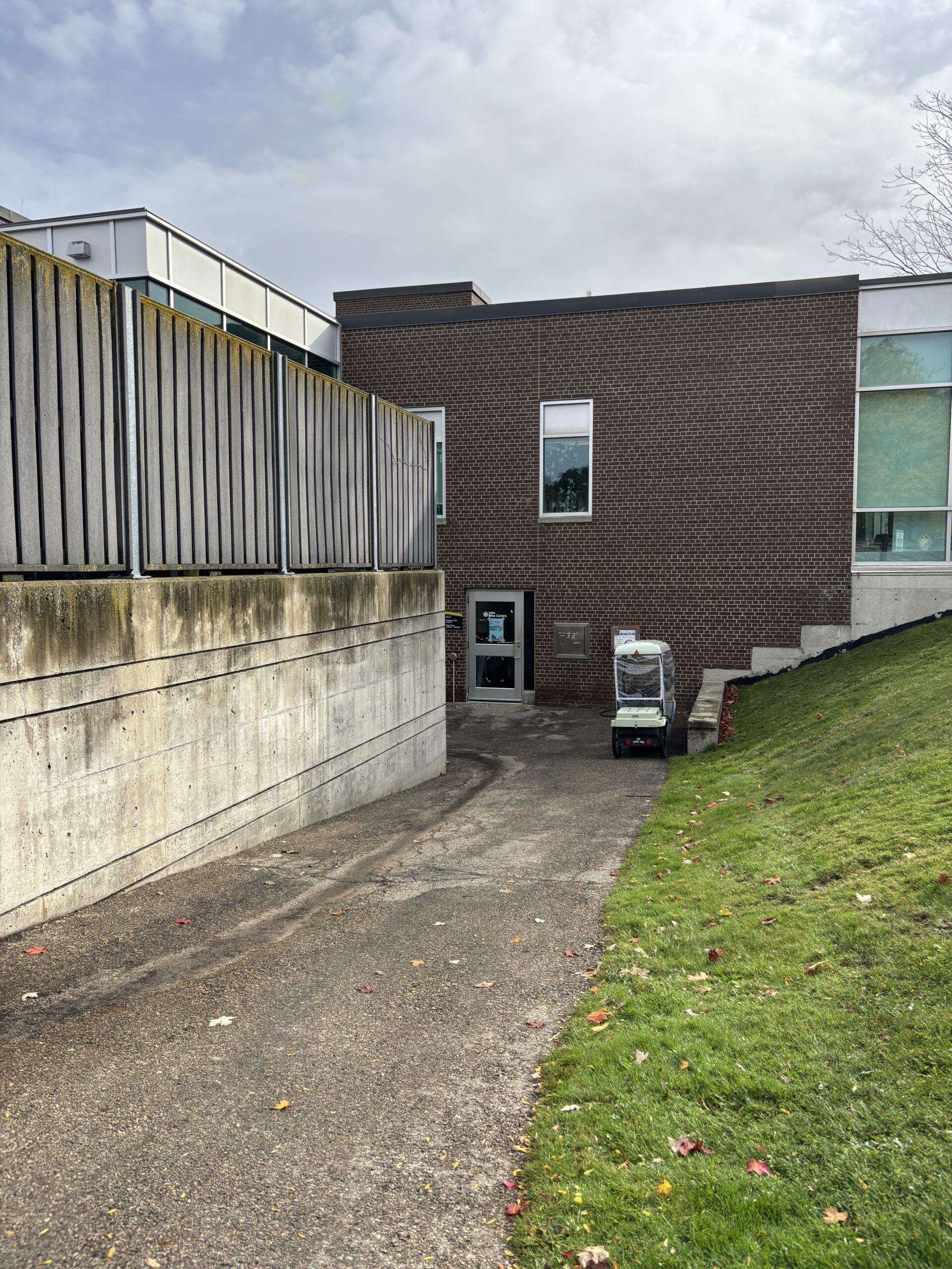 4. Once outside, turn right and follow the sidewalk toward the Bike Center area near the parking lot.