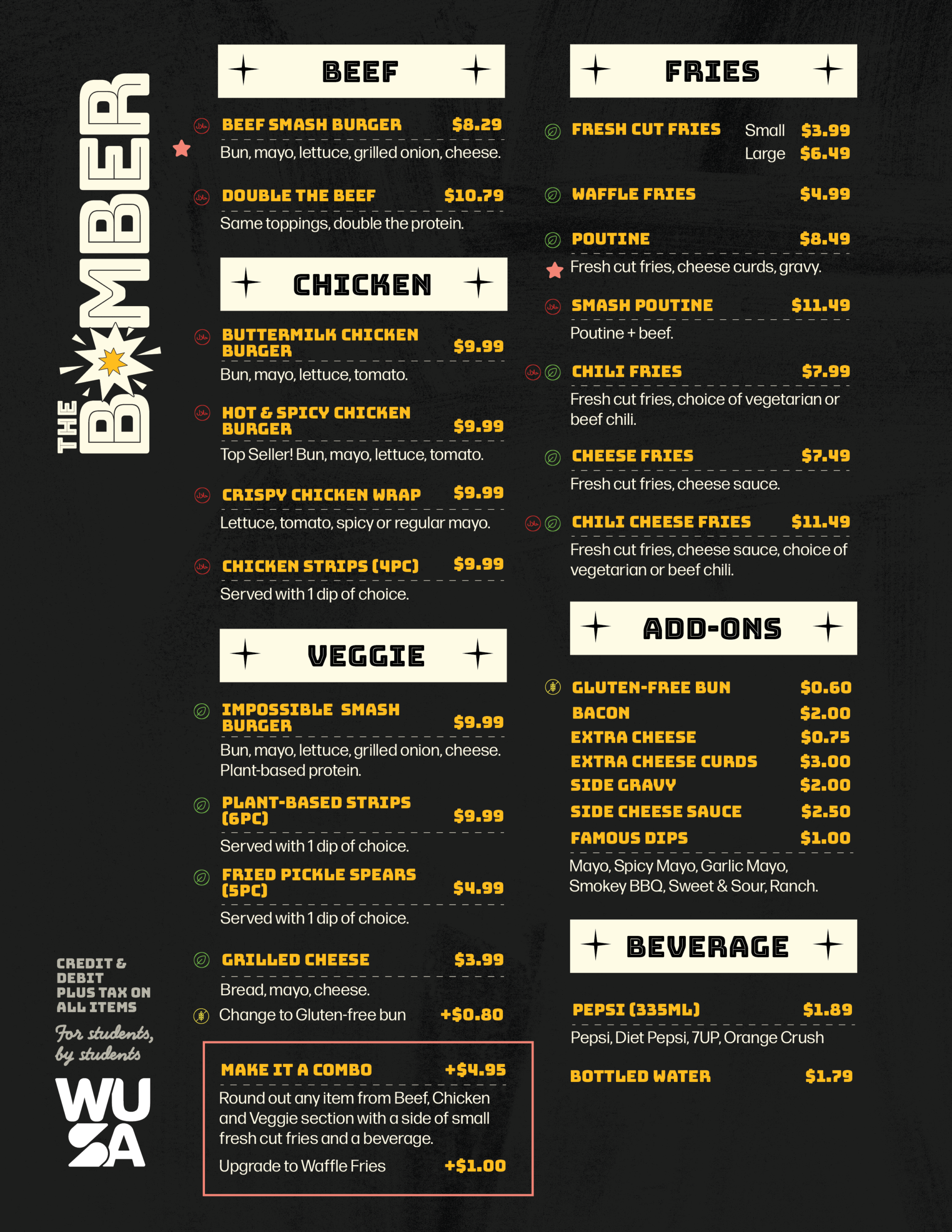 Your go-to for a quick, delicious meal at an affordable price. Whether you’re looking for a Smash Burger, craving crispy chicken or a vegetarian option, we have something for you.